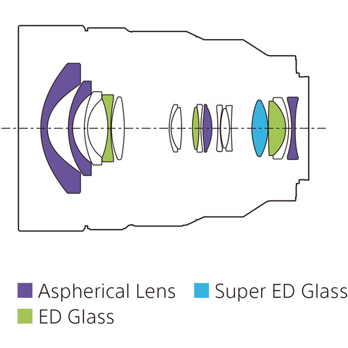 Jedna soczewka ze szkła Super ED (o bardzo małej dyspersji) i trzy elementy ze szkła ED są rozmieszczone strategicznie w celu zminimalizowania aberracji chromatycznej. Dzięki skutecznej redukcji aberracji chromatycznej uzyskano poprawę ostrości i klarowności obrazu.